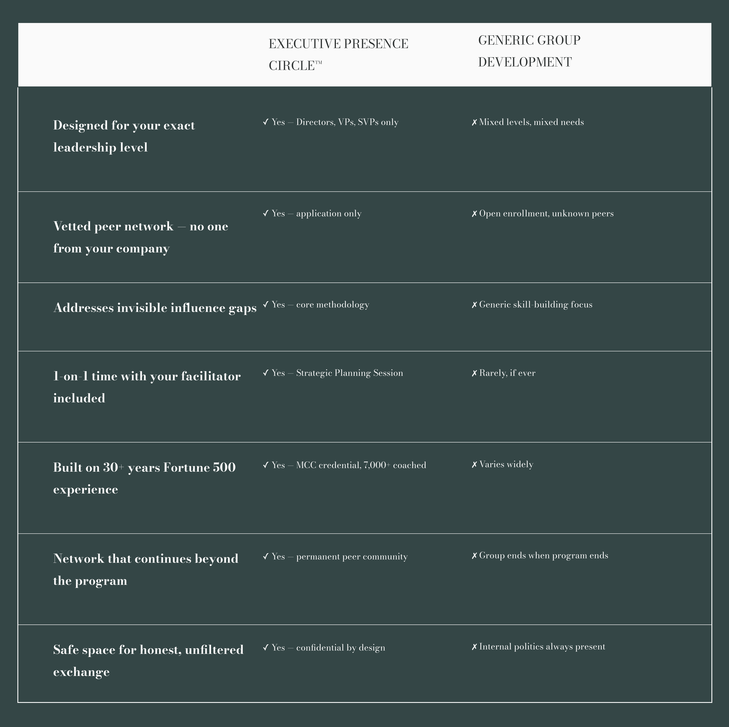Access to a facilitator with 30+ years of Fortune 500 experience and the MCC credential (top 5% globally)